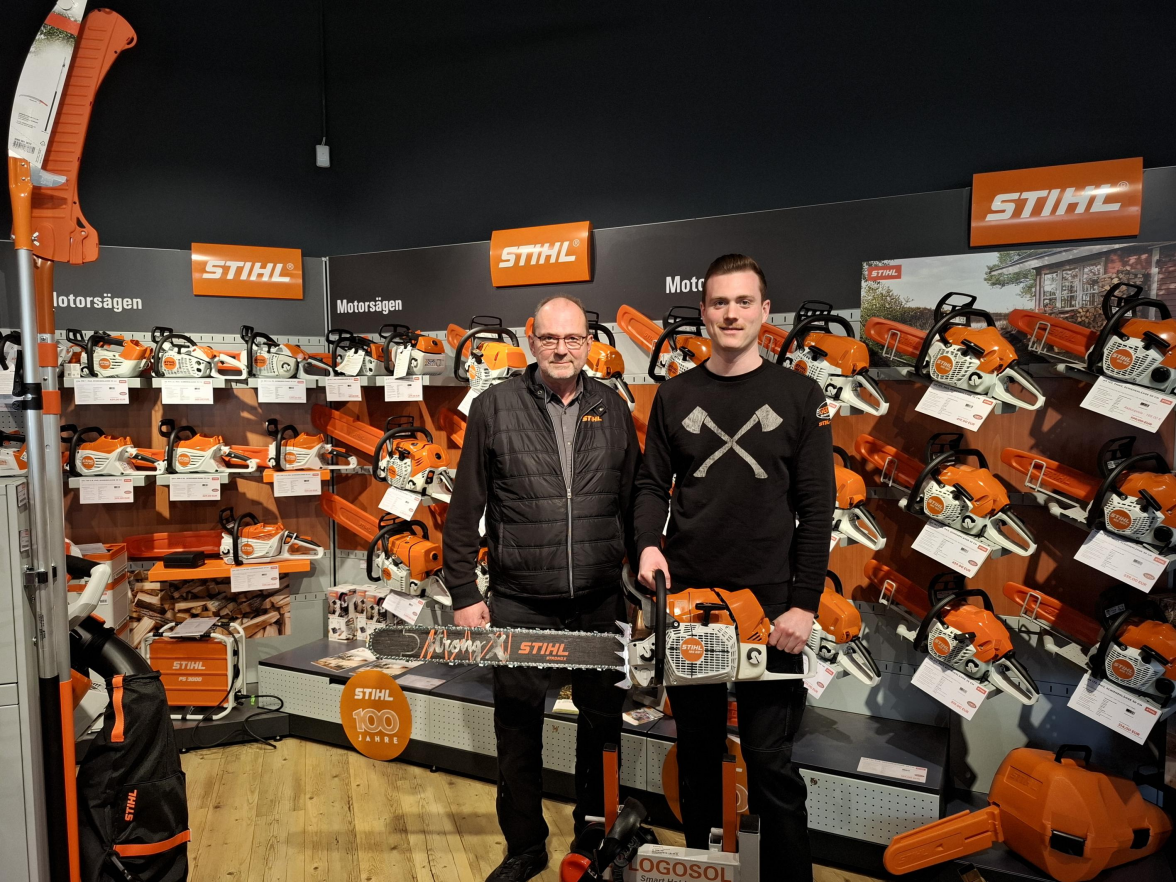 1975 begann Jürgen Gertje seine Ausbildung bei der damaligen Firma Karl Grimm in Bad Zwischenahn und ein Jahr später kam er mit dem Unternehmen Stihl in Kontakt – so ist er 50 Jahre mit der Marke Stihl verbunden, die in diesem Jahr bereits das 100-jährige Jubiläum feierte. Jürgen Gertje und seine Frau hatten eine Einladung und durften in Mainz bei der Jubiläumsfeier dabei sein. 13 Jahre war er bei Firma Grimm beschäftigt und zwölf Jahre bei dem früheren Betrieb Martin in Rostrup, bevor er 2001 in Apen startete. „Ich habe stets Schritt für Schritt erweitert, mir jede bauliche Erweiterung sehr gut überlegt und die Zukunft stets im Blick gehabt.“ Sohn Jannik hat schon als Kind gerne Zeit im Laden und in der Werkstatt verbracht. „Als ich zur Schule ging, habe ich dann auch schon geholfen.“ Nach dem Abitur hat Jannik in Emden Betriebswirtschaft studiert und den praktischen Teil des Studiums bei Stihl absolviert – Abschluss war 2018. Seitdem ist der 29-Jährige als Vollzeitkraft im familiären Unternehmen tätig und wird den Betrieb in zweiter Generation fortführen.
