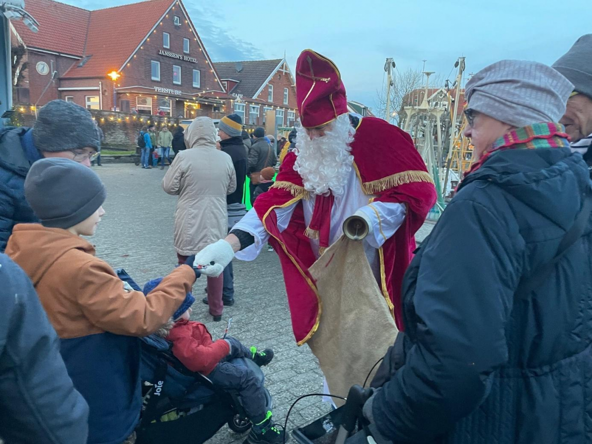 Höhepunkt am 1. Advent ist um 17 Uhr die Ankunft des Nikolaus. Besonders die Kinder dürften sich freuen, wenn der Mann im roten Mantel und mit weißem Bart von See kommend mit dem Traditionskutter „Lulu Meinders“ in den Hafen einläuft. Den Gabensack auf dem Rücken begibt sich der heilige Nikolaus zur Konzertmuschel, um dort die Kinder zu beschenken.