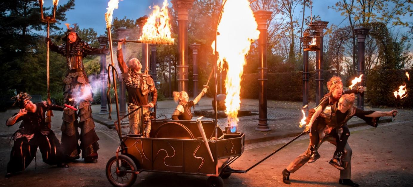 Für eine gruselige Stimmung sorgt unter anderem auch die spektakuläre Show „Die Feuerreise“. Ein knarrender Feuerwagen, beladen mit einem Käfig voller Flammen, wird von mystischen Feuerwesen begleitet, die das Publikum mit ihrer Kunst verzaubern. Majestätisch schreitet Thyriorn, ein Gigant auf Stelzen, durch die Menge, während seine Feuerschergen ihm zur Seite stehen. Mit gewaltigen Feuerwerkzeugen und interaktiven Einlagen sorgen sie für ein unvergessliches Erlebnis.