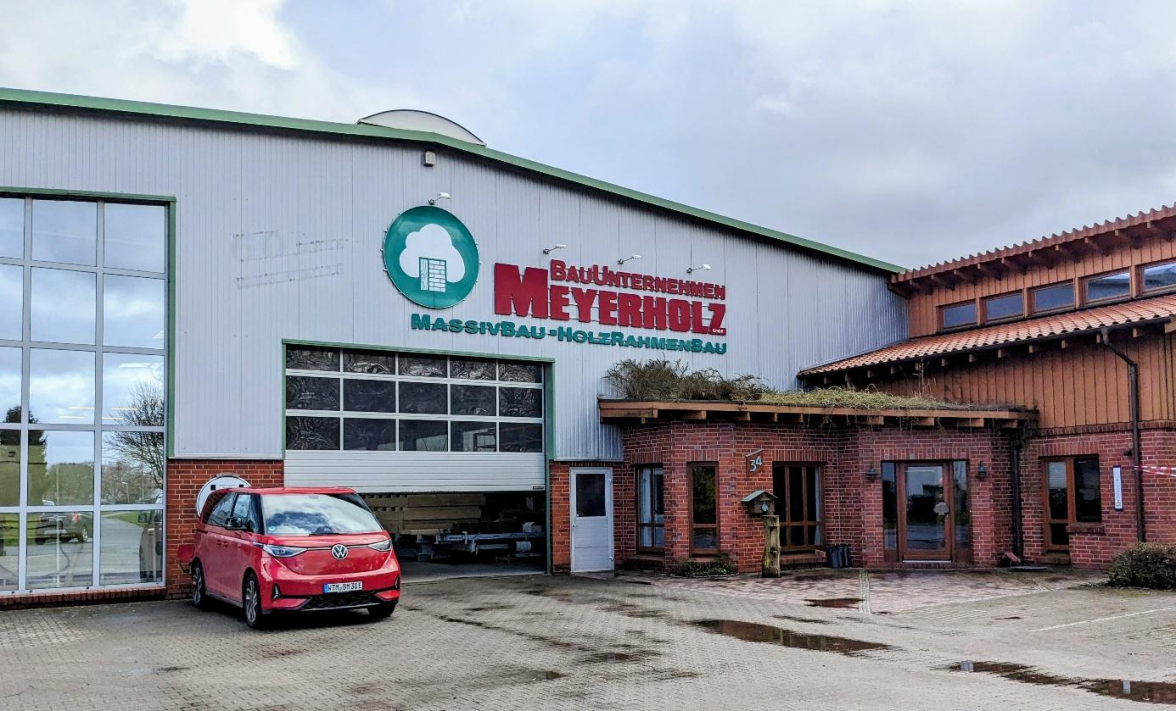 Vom Strooter Weg zog das Unternehmen Meyerholz in den 60er-Jahren an den Hohen Weg 14. Karl-Heinz Meyerholz erweiterte den Fuhrpark anfangs um einen gebrauchten VW, dann kam ein Bulli T1 dazu, es folgten eigene Kräne, Radlader und Lastwagen. Schon frühzeitig hatte Karl-Heinz Meyerholz seinen Sohn Rainer in den Betrieb involviert. Rainer Meyerholz, der ebenfalls eine Maurerausbildung und außerdem ein Architekturstudium absolviert hatte, übernahm 1980 den väterlichen Betrieb als Geschäftsführer. Sein Sohn Ulf wiederum, ebenfalls gelernter Maurer und studierter Bauingenieur, stieg nach einer kurzen Stippvisite in einem anderen Bauunternehmen 1998 in den elterlichen Betrieb ein. Das war auch das Jahr, in dem die Firma Meyerholz sich mit einem Neubau im Gewerbegebiet Marx ansiedelte. 20 Jahre lang arbeiteten Vater und Sohn Meyerholz Hand in Hand. Wobei mit Ulf Meyerholz auch der Holzrahmenbau in das Portfolio des Unternehmens aufgenommen wurde. Heute stehen der Massivbau und der Holzbau gleichberechtigt nebeneinander und werden auch gerne miteinander kombiniert.