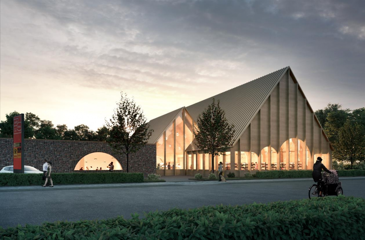 Mit seinen teils historischen Gebäuden versprüht Wardenburg auch heute noch seinen ganz besonderen Charme. Das zeigt sich auch in der architektonischen Gestaltung des neuen Marktes: Angelehnt an die einstige Hofstelle der Familie Barelmann auf dem Gelände erinnert der Neubau mit seinem Spitzdach und Fensterelementen in Form einer Groot Dör an ein typisches Bauernhaus. Das betont auch Architekt Lars Frerichs vom Büro „Neun Grad Architektur“. Gleichzeitig erleben Kundinnen und Kunden in dem mit seinen zwölf Metern Höhe fast schon sakral wirkenden Bau eine Markthallen-Atmosphäre mit einer hohen Aufenthaltsqualität.