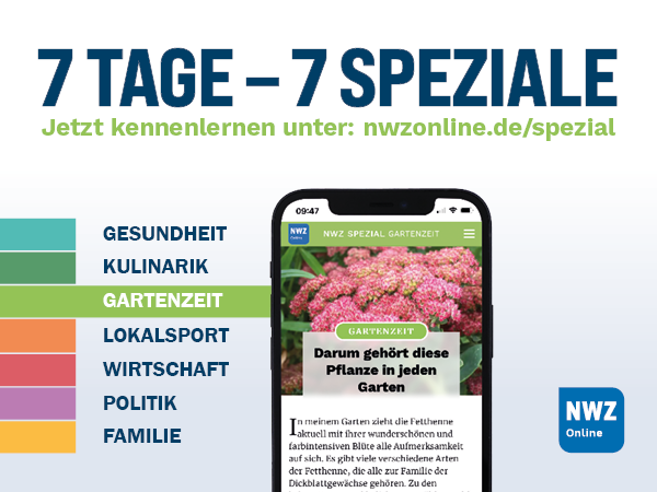 Gesundheit, Garten, Politik, Familie: Auf NWZonline und in der App gibt jeden Tag ein neues redaktionelles Spezial. Die Nordwest-Zeitung bündelt damit besonders stark nachgefragte Themen in klar erkennbaren Schwerpunkten - mit fundierten Berichten, Serviceangeboten und multimedialen Inhalten.
