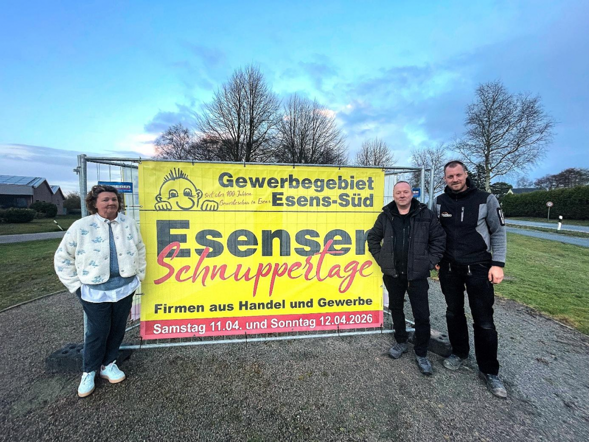Esens Der Himmel zieht sich leicht zu, als Marion Janßen, Marco Fauerbach und Stefan Steinberg für ein Gruppenfoto vor dem Banner der diesjährigen „Schnuppertage“ Aufstellung nehmen. Trotz der ungemütlichen Witterung freuen sich die Kassenwartin, der Vorsitzende sowie der zweite Vorsitzende der IG Gewerbegebiet Esens-Süd, erneut zur Gewerbeschau in der Bärenstadt einladen zu können.