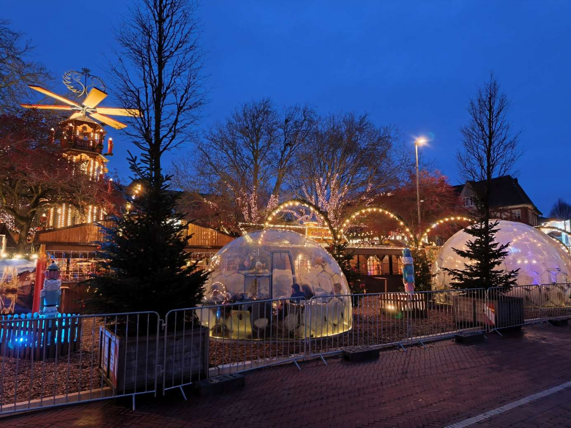 Ganz neu sind die 3 Winter-Domes, gläserne Iglus, die an traditionelle Schneekugeln erinnern. Mit einem exklusiven Blick auf den Delft mit seinen historischen Museumsschiffen, können diese Winterzauberkugeln von kleinen Gruppen stündlich angemietet werden. In den beiden kleineren Kugeln finden 6-8 Personen Platz, in der großen sogar 10-12 Personen. Feine Lufteinlässe gewährleisten ausreichende Frischluftzufuhr und sorgen für ein angenehmes Raumklima, das sich mit dem Aufenthalt im Freien vergleichen lässt. Wer es etwas wärmer mag - die Kugeln sind auch beheizbar. Buchbar sind sie (inklusive Mindestverzehr) unter www.maritimer-engelkemarkt.de .